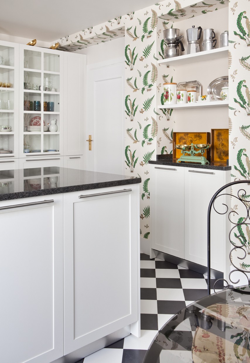 Nuestro cliente quería representarse en todos los elementos de esta cocina, contaba con recuerdos familiares que fueron incluidos al espacio para crear un ambiente muy personal. El suelo damero es el componente principal del espacio, sobre el cual se levantan los demás elementos. Para los armarios se ha utilizado un modelo con moldura y tirador, en laca texturizada de color blanco, que aporta seriedad al ser un modelo clásico con moldura. La encimera es de granito pulido en color negro sudáfrica.